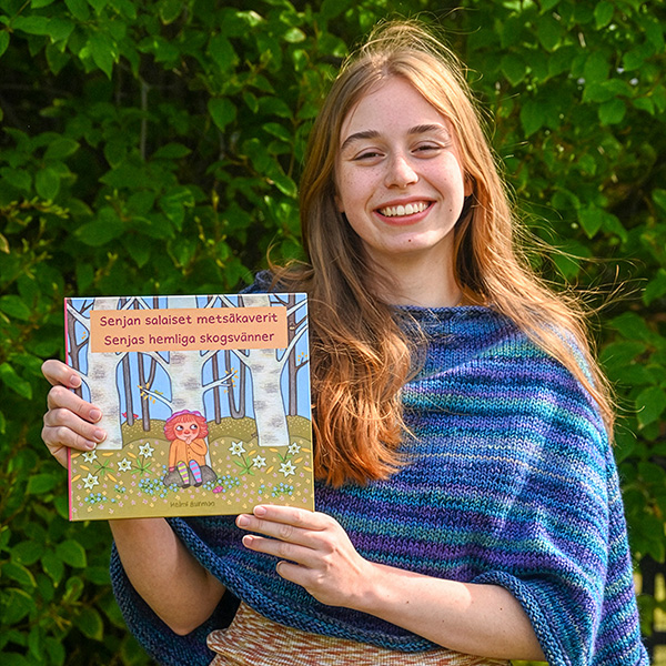 Helmi ja kirjansa Senjan salaiset metsäkaverit – Senjas hemliga skogsvänner, jonka hän on myös kuvittanut. Kuva: Yksityinen