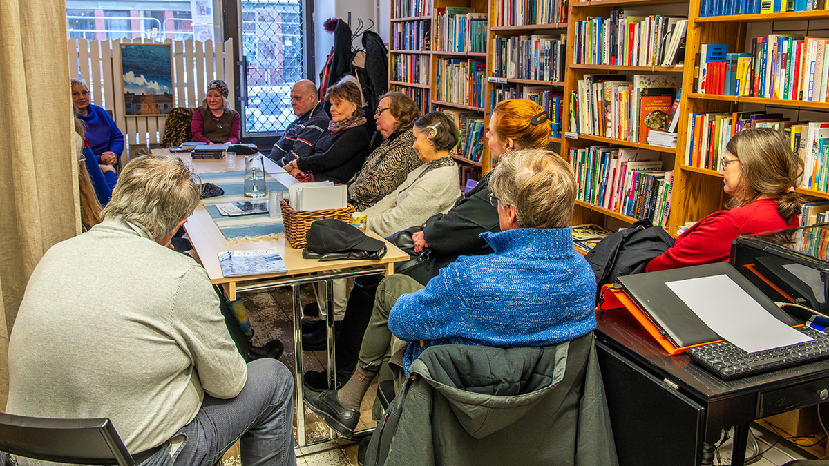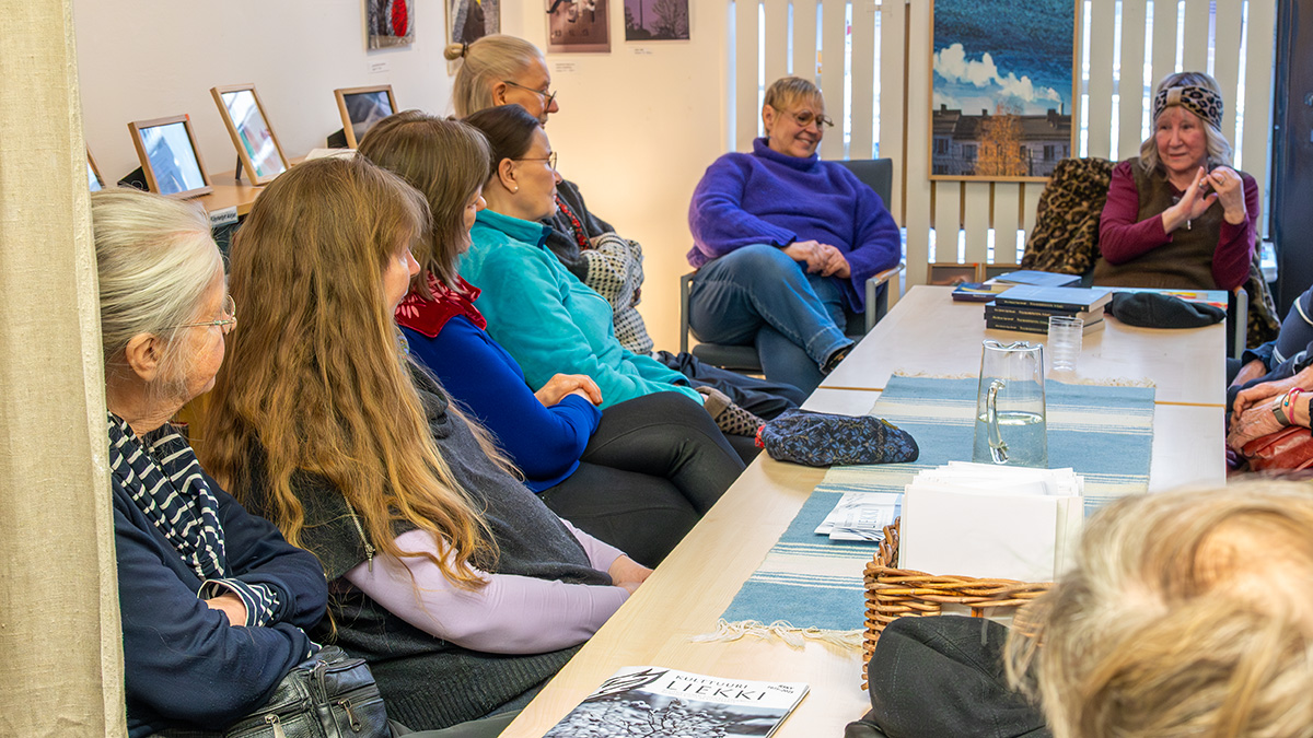 Kymmenkunta henkilöä oli tullut kuuntelemaan, kun Pirjo kertoi kirjoittamisestaan ja maailmanmatkaajan elämästään. Raija vei haastattelua joustavasti eteen päin ja oli valinnut hyviä kohtia Pirjon kirjoista, Pirjon humoristinen tyyli ja sujuva kieli pääsivät oikeuksiinsa. Pirjo on kirjoittanut kolme kirjaa: Lempeät tuulet Tyyneltä mereltä, Kuolema Tuhannen nuolen lahdella ja Riikinkukon siiven alla.
