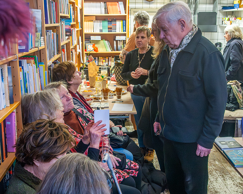 Yllätysvieraana juhlassa kirjailija Asko Sahlberg Göteborgista. KIrjakaupan Seppo Poutanen haastattelee. |